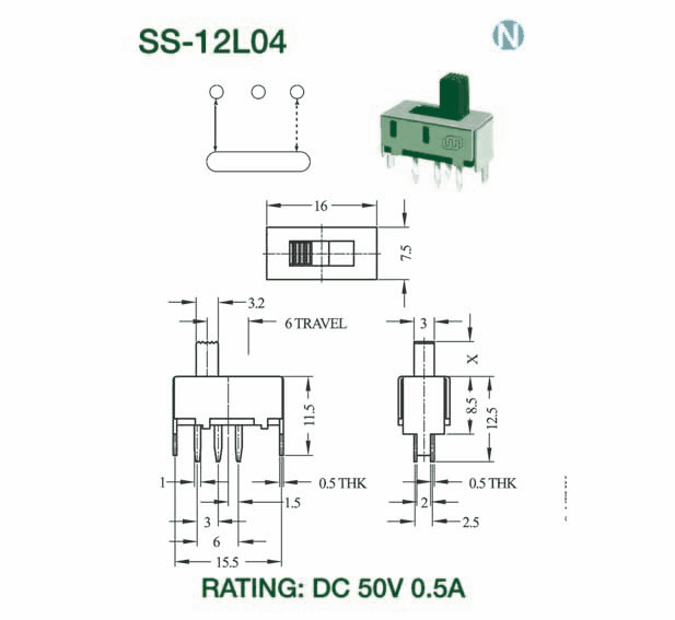 立 式 滑 动 开 关 主 要 技 术 特 性 The Vertical Slide Switch Main Characteristics of Technology | 额定负荷 Rated Load | DC 50V 0.5A | | 操作温度 Operating Temperature | -16℃ to 60℃ | 接触电阻 contact Resistance | < 30 mΩ | 寿 命 Life Test | 10,000次 | 绝缘电阻 Insulation Resistance | > 100 MΩ | 作用力 Operating Force | 250gf ± 100gf |
